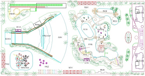 ? ? ? ?湖北黃石水上樂(lè)園占地28333平方,呈長(zhǎng)方形狀,客戶投資額度不是很高,要求:以家庭合家歡為主,主要凸顯兒童快樂(lè)!因?yàn)轫?xiàng)目是規(guī)矩的長(zhǎng)方形,為了打破這種死硬格局,設(shè)計(jì)師用略顯活潑的兒童山坡滑梯以多個(gè)池階梯層次來(lái)分割長(zhǎng)方形格局,